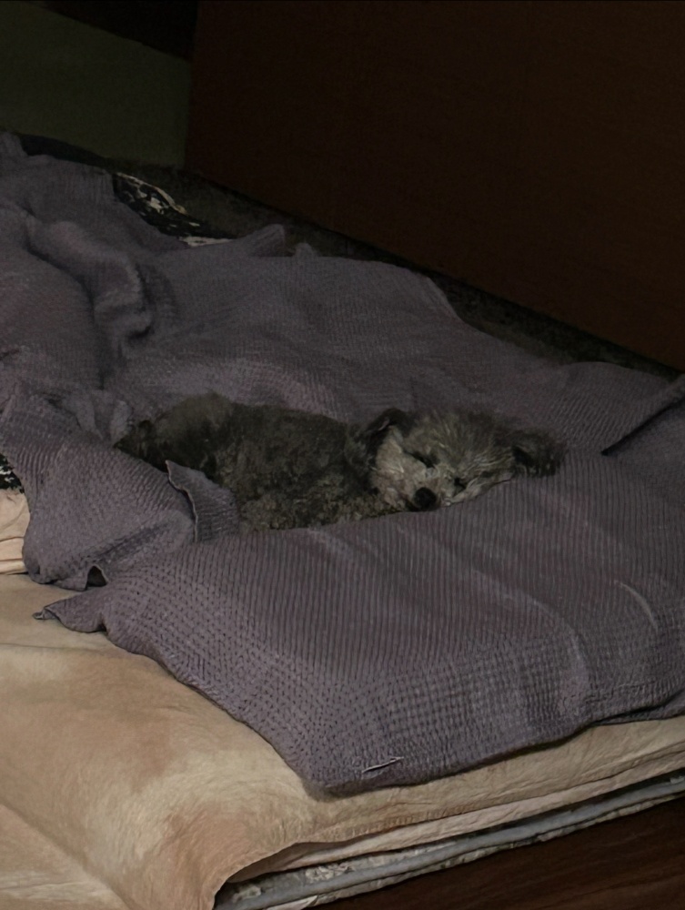 リネンのスローケットで気持ち良さそうに寝るワン🐶見てるだけで癒されますね✨ありがとうございます🌸