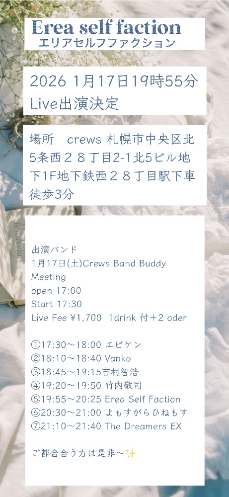 お願いがあります。ライブやイベントなどについてです。ちょうど、お客様からタイミングのよい話がでました。習い事などを通じてチケット🎫を無理矢理買わされる話しです。主催側はノルマの達成に力が入り少し強引になってしまうパターン💧良い悪いは無いですが私が関わる事でその様な状況は作りたくないので一切の忖度やお付き合いは無しでお願いします🙇♂️また少し強引に誘われたけど行って見たら人生変わりました😊パターンもあると思いますのでしっかり自分で心の中と相談してみてください。よろしくお願いします。本当に来てみたいなぁ〜と思ったら是非いらしてください🩷